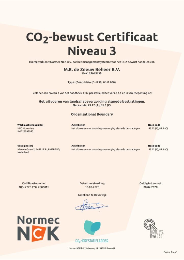 - CO2-bewust certificaat niveau 3: Geeft aan dat HPG permanent zoekt naar nieuwe mogelijkheden om de uitstoot als gevolg van de eigen bedrijfsvoering en de eigen projecten terug te dringen. Elk jaar stelt HPG doelen ten aanzien van de totale CO2-uitstoot van het bedrijf. Lees meer hierover op CO2-prestatieladder.